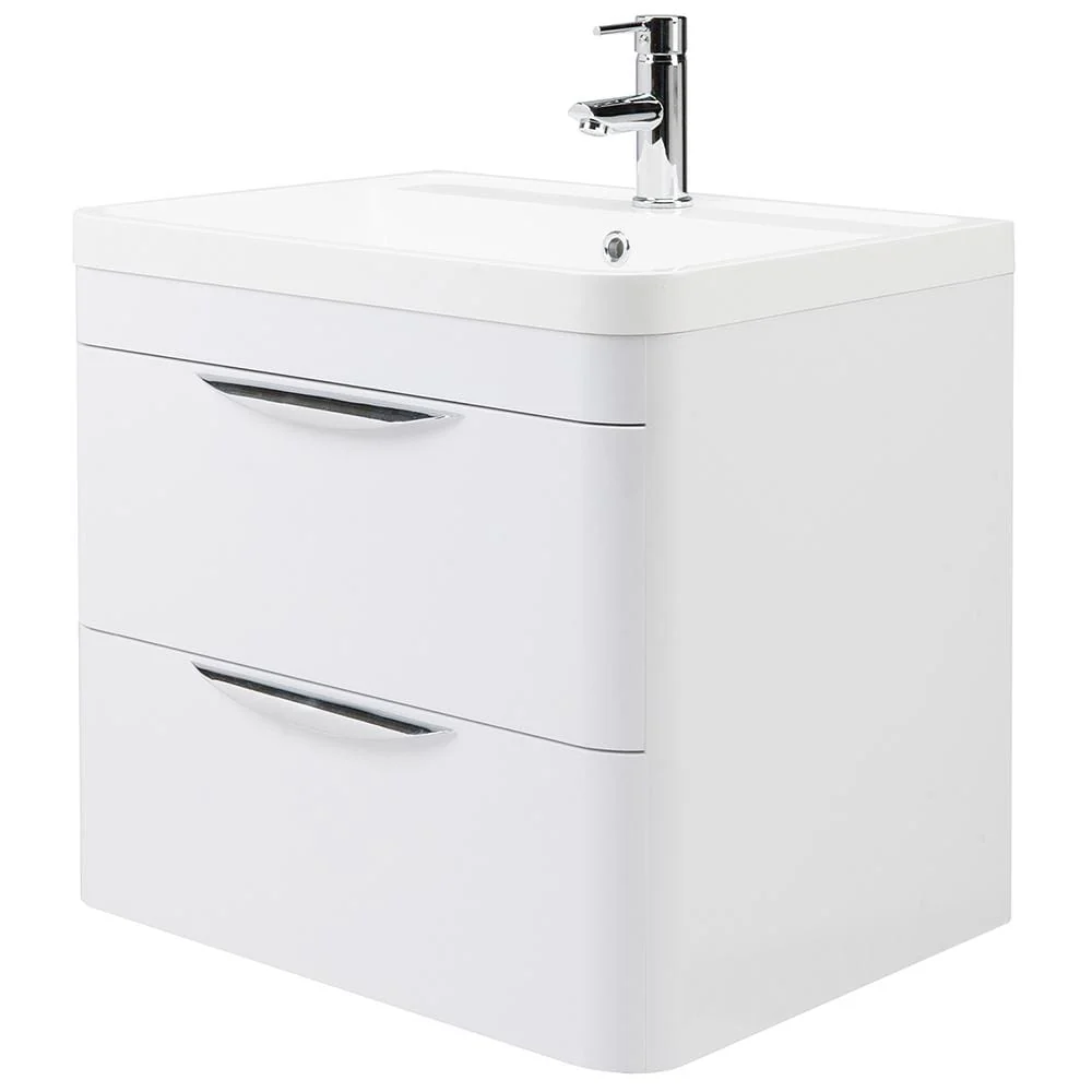 The gloss white finish compliments the gentle curves to create a designer look. This wall hung unit creates more space in your bathroom giving the illusion of a bigger bathroom. This unit has soft close drawers which limits the daily wear and tear and provides a quieter closing action. Colour co-ordinate your unit with a gloss white WC unit. Height: 540 mm Weight: 38.94 kg Width: 600 mm Depth: 445 mm Material: MFC Smooth Matt,Polymarble Tap Holes: 1 Waste: No Bowl Shape: Rectangular Inner Bowl Height: 110.0000 mm Mount Type: Wall Hung Handle Type: Cup Construction Type: Rigid Fascia Thickness: 18.0000 mm Drawer Type: 80mm High Metal S/C Inc Gallery Number of Shelves: 0 Legs Included: No Manufacture Guarantee: 5 Years Guarantee Details: During installation extra care must be taken to avoid damaging the fittings. We provide Manufacture Guarantee against faulty workmanship or materials (excluding serviceable parts), providing they have been installed, cared for and used in accordance with our instructions.